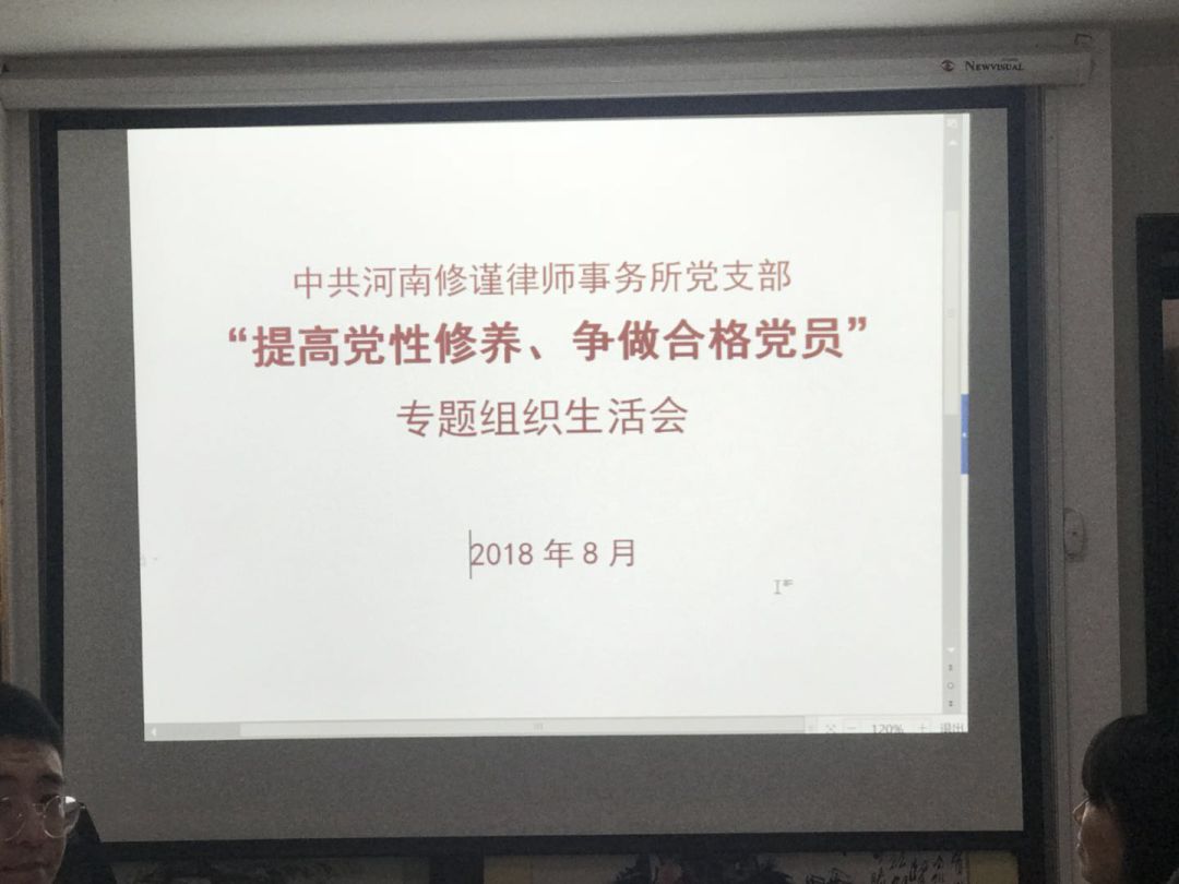 党性是党员立身、立业、立言、立德的基石,必须在严格的党内生活锻炼中不断加强。为认真贯彻落实党的十九大精神,切实增强党员干部的党性修养,解决部分党员意识淡薄、言行失范等问题,加强党内民主监督,增强党组织活力。按照上级党组织要求,中共河南修谨律师事务所党支部于8月31日开展以“提高党性修养,争做合格党员”为主题的专题组织生活会。