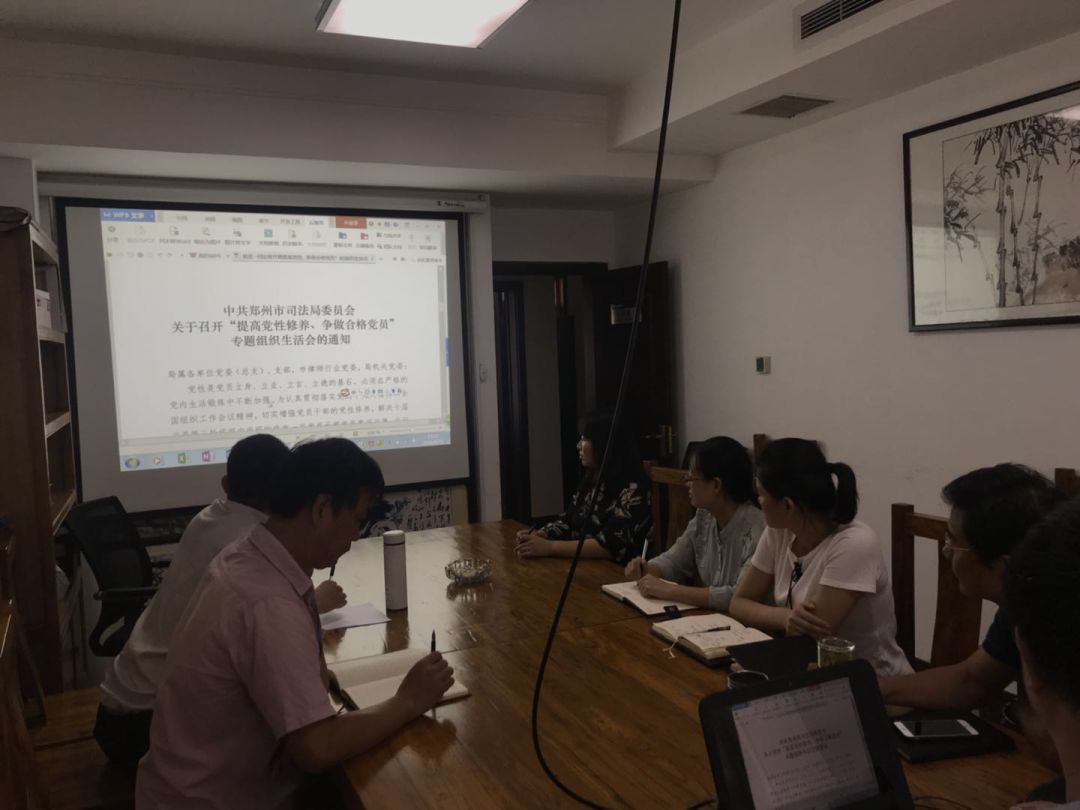 本次会议由党支部书记王星波主任主持召开,并严格按照组织生活会的程序步骤进行:首先由王星波主任阐述了本次组织生活会的主题和要求,宣读了郑州市司法局党委《关于召开“提高党性修养、争做合格党员”专题组织生活会的通知》,传达文件精神。第一、要求全体党员认真学习习近平新时代中国特色社会主义思想,学习党风党纪、党章党规;第二、严肃认真开展批评与自我批评,进一步强化党的观念,提高党性修养。
