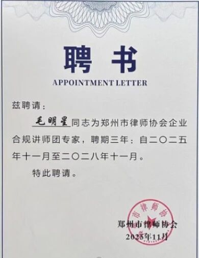 在本次启动仪式的核心亮点环节 —— 企业法律服务讲师团聘书颁发仪式上,河南修谨律师事务所主任毛明星凭借其在企业法律服务领域深耕多年的专业素养、丰富实战经验及卓越行业影响力,成功受聘为“企业合规讲师团专家”。未来,毛主任将深度参与企业法治培训、合规管理辅导、法律风险防控等专项法律服务活动,为企业高质量发展提供精准、专业的法律支持。